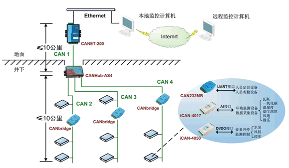 通过CANET-200将井下CAN数据同EtherNET数据透明转换,最终实现通过Internet对矿井情况进行远程监控的信息化管理。 |